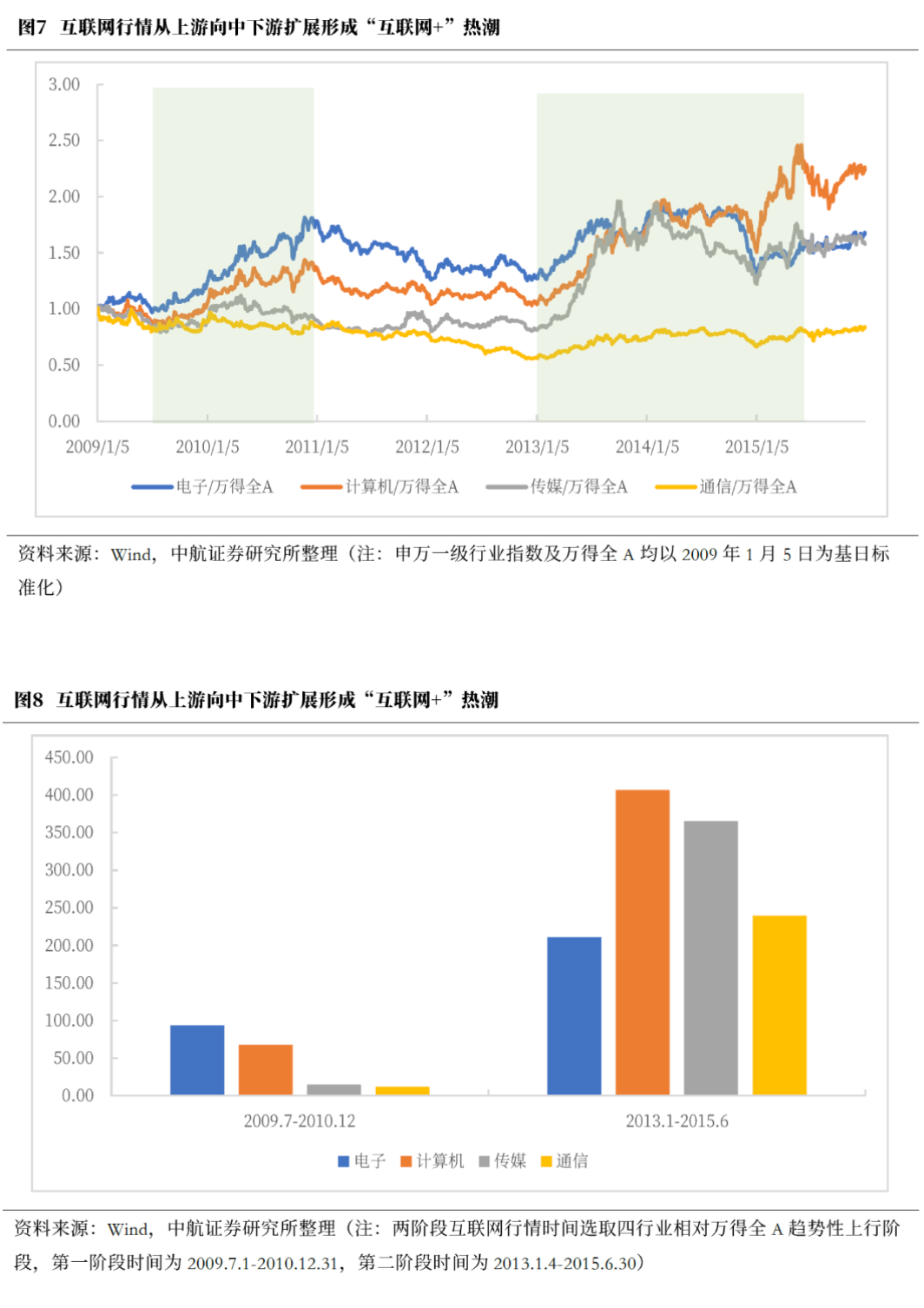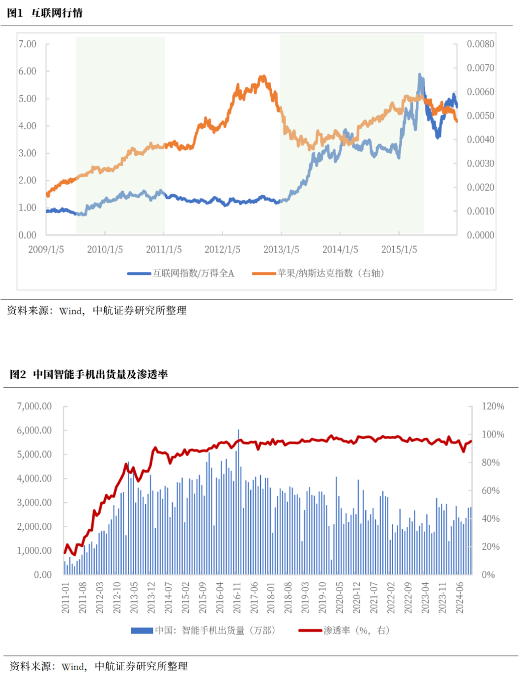 标志性事件为,苹果手机在中国市场份额出现下滑,2013年第二季度在中国市场份额一度不足5%。同时政策端配套措施也在2013~2015年密集推出。2013 年 8 月,国务院印发《关于促进信息消费扩大内需的若干意见》,促进信息消费,提出实施“宽带中国”战略,统筹推进移动通信发展;2013年12月工信部发放4G牌照,推动移动互联网布局。此后在相关政策持续出台支撑下,2013年1月至2015年6月,国内互联网行情爆发,互联网指数快速拉升,持续大幅跑赢万得全A。